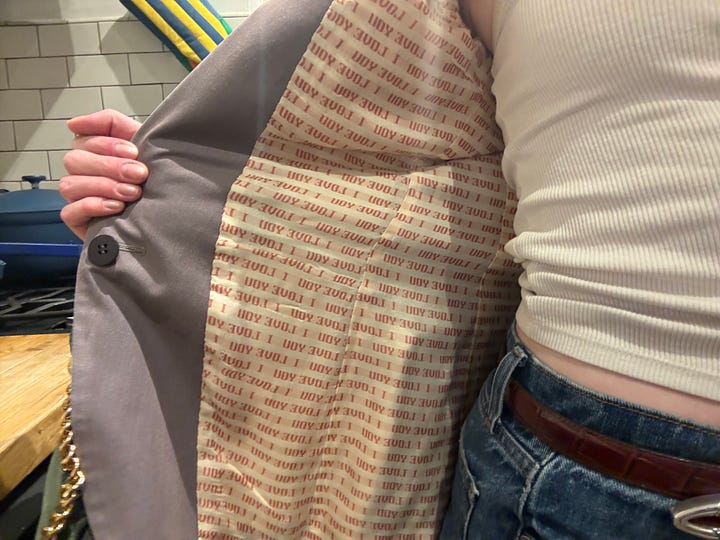 I also finally wore the vintage Chloé blazer I bought at James Veloria earlier this year. It fit like a glove and I felt like a girlboss at the G-FORE Ryder Cup party. My mom and I were twinning which doesn’t help the lookalike allegations (I would be so lucky). It has this super fun novelty lining that we don’t see enough of these days. The Dolce jacket has a leopard print lining, which is just fabulous.