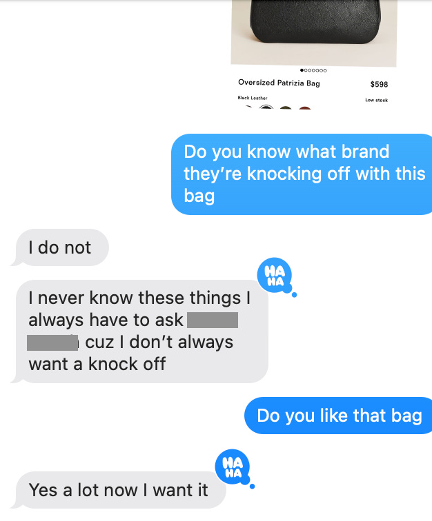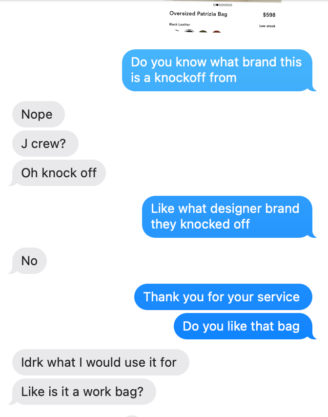 Friend B proves this point. She didn’t know where the silhouette was from, but she wants it. I would’ve love to work the checkout of H&M on that Saturday and asked every customer who bought the $60 Fauxgaux if they knew what it was, or simply needed a new black work bag.
