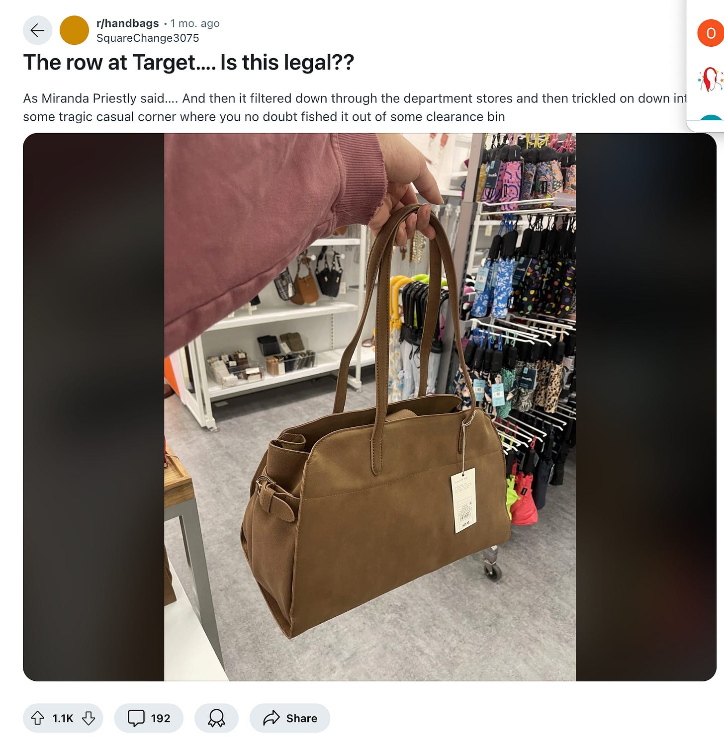 I’d like to speak to the legal team over at The Row, but that would defeat the purpose of confidentiality. I just want to know—are they going after these knockoffs? The case for intellectual property seems pretty strong, but I have a BFA and not a JD. Do they ever go after any knockoffs? A quick Google search brought me to the Reddit community, who seems just as shocked as I am.
