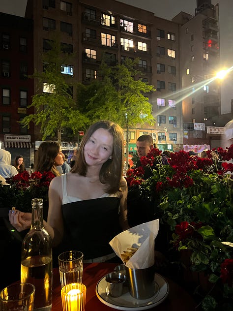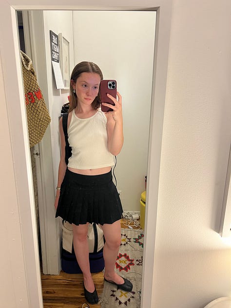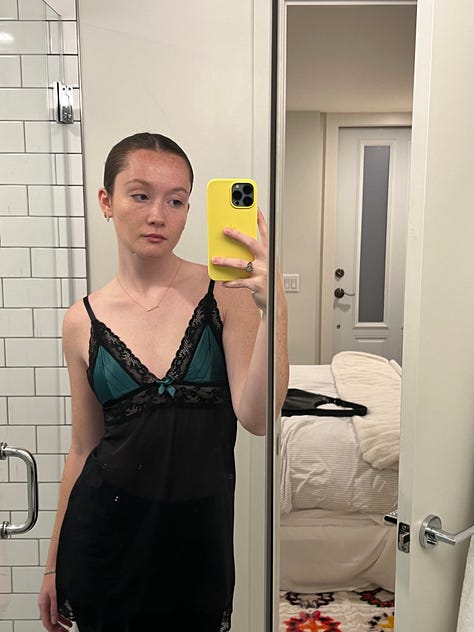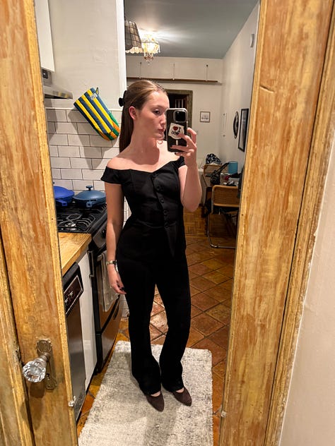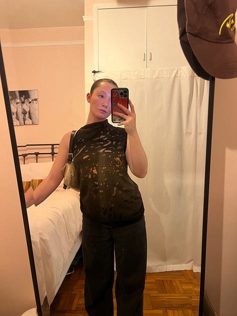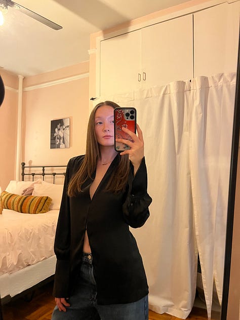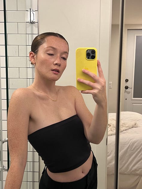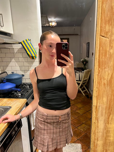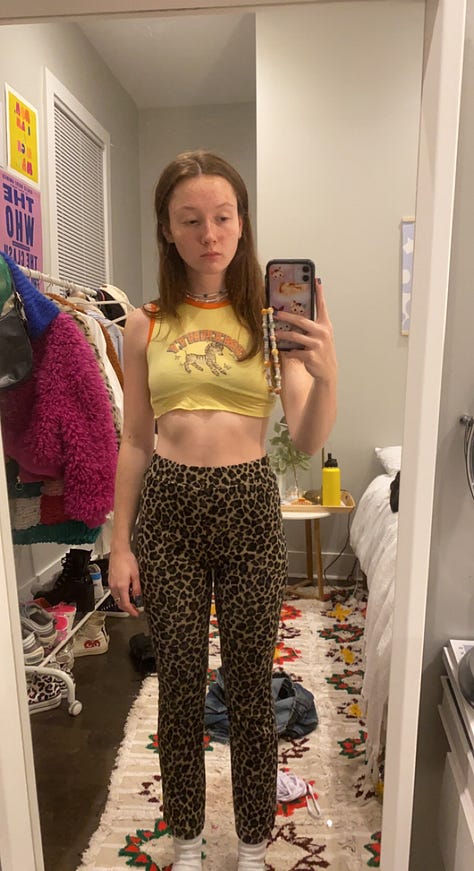 I write this week’s letter from my bedroom at my mom’s house in Connecticut, which houses approximately 100 going out tops of my past, present, and future. In recent efforts to declutter and bring myself out of minor financial strain, I’ve sold 10 bags of clothes on ThredUp, 8 of them from these four walls. Going out tops, in case you’re not familiar, require the least amount of fabric than any other garment besides a thong or a sock. I begrudgingly sold probably 20, coming to terms with the fact that I probably would never wear something made of scuba-adjacent fabric with a metal ring in the middle ever again.