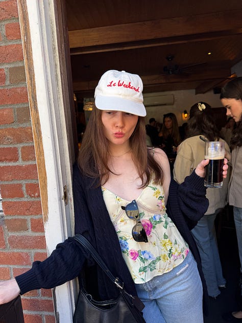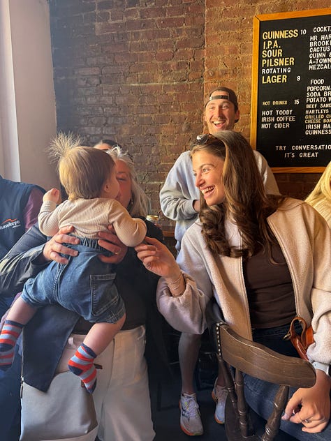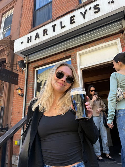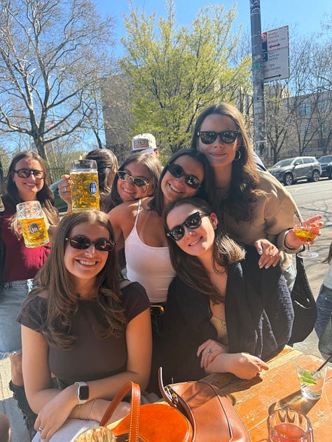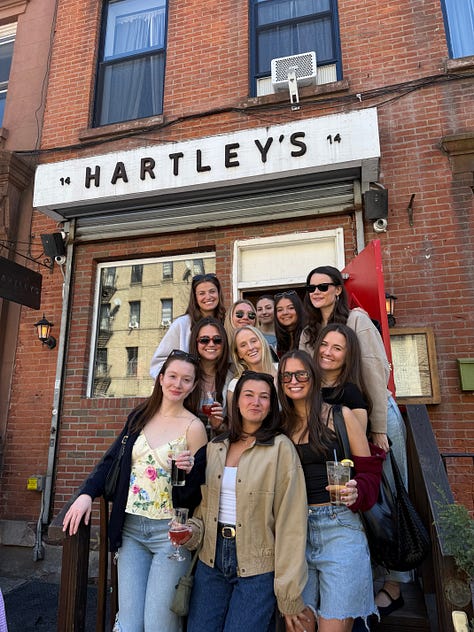 Hartley’s was a fabulous institution that I will frequent now. I’m not afraid of the A/C/E train. There was a one-year-old’s birthday party happening there (which was hilarious and genius, having your baby’s first birthday at a bar) who also happened to be named Sully (like one of our best friends), the bartender gave Hartley a cup for free, and I had two half-pints of Guinness (one full pint, I came to realize). We snapped pics in the late afternoon sun—a lesson we learned the hard way by not having a single picture of the 11 of us since 2018—enjoyed ciders, sang happy birthday to Sully, and added some college roommates and boyfriends to the mix, another really beautiful part of growing up with your best friends, getting to meet their best friends and people who love them just as much.