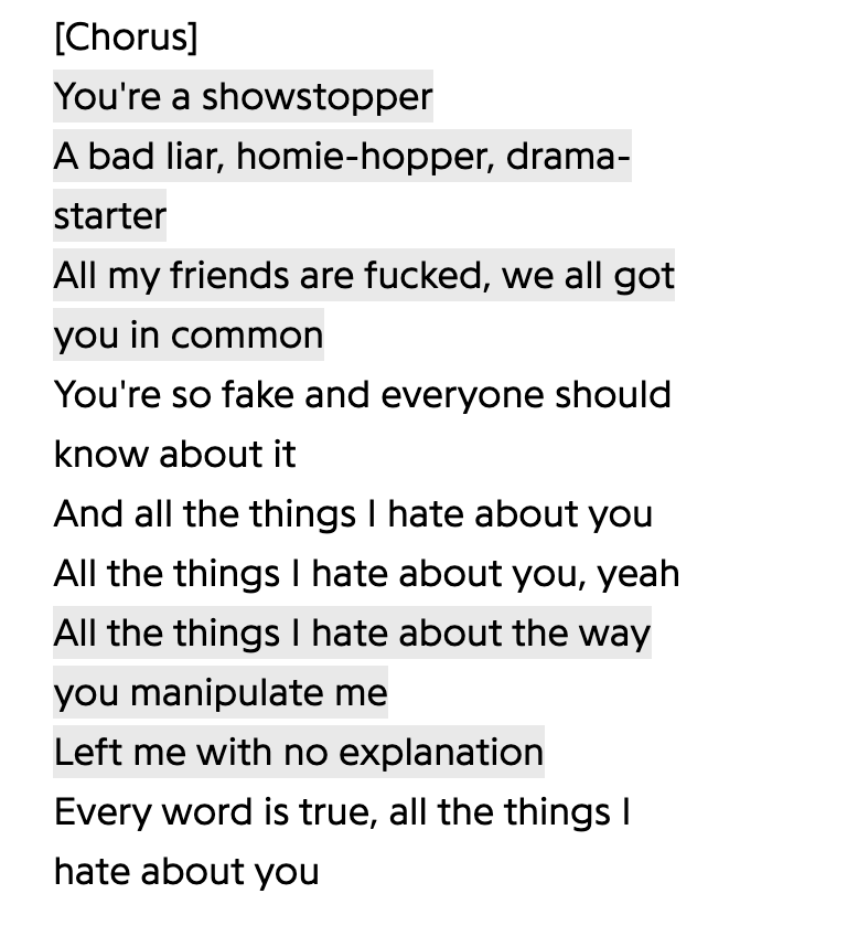 Designed to be a wannabe “7 Things I Hate About You” a la Miley Cyrus 2007, this structure of breakup/revenge song isn’t new or innovative. The artist riddles off extremely specific things about their ex that makes it blatantly obvious who the song is about, allowing their brigade of fans and followers to identify (and harass) the subject directly.