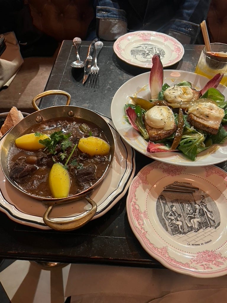 Dinner at Les Antiquaires was one of those happy accidents that happens on vacation and ends up being the thing you can’t stop talking about most. My mom and I wanted to go to Le Relais de Venise L'Entrecôte for the famous steak frites, but the line was already down the block before it opened and we didn’t feel like waiting. I can’t remember exactly how I had bookmarked this place on Google Maps, but we loved every part of this dinner. The boeuf bourguignon was tender and delicious, the service was warm and friendly, and everyone in there was speaking French, so I’m pretty sure it was a local hotspot, which made us feel really cool.