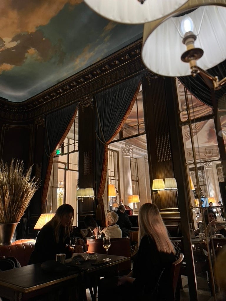 Everyone should treat themselves to fancy drinks in Paris. This was a recommendation from my favorite podcaster and spiritual guide, Jackie Schimmel-Haas of the Bitch Bible, who says she loves to enjoy a solo martini here on her periodic trips to Paris. I’m really glad this was the hotel we got a drink at, the service was great, the martini was in fact delicious, there was a live pianist and bass player, and the vibes were simply put—rich.