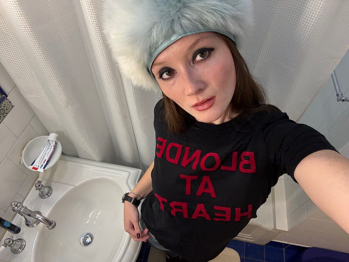 Even though it was Halloween, I was kind of exhausted by dressing up, so I just put on heavy eyeliner and a fun hat and my Blonde At Heart tee made by my bestie