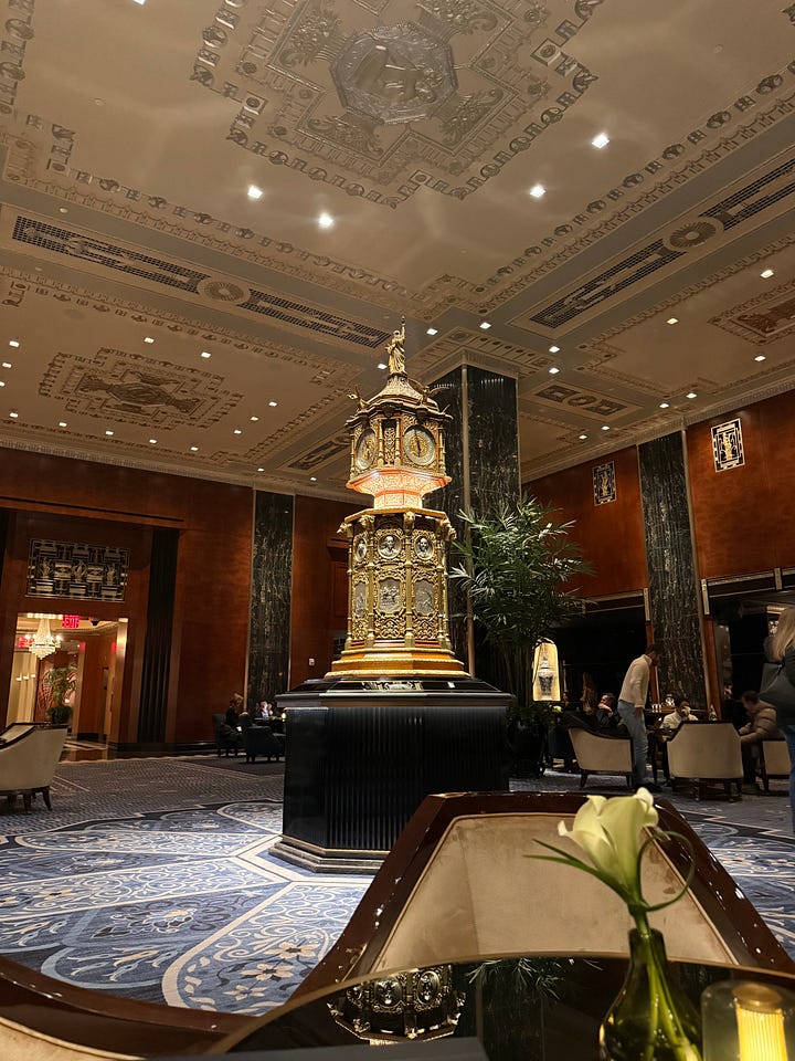 On Friday, my mom and I visited Peacock Alley at the newly-renovated Waldorf Astoria in midtown. The hostesses wore very tight gold-sequined gowns which was very interesting to me. We ordered Pornstar Martinis and engaged in excellent people watching. Lots of young couples at such a dry, stuffy place, it was fascinating to me. I wondered if any of them had come from the new JP Morgan building down the street. The space itself is very beautiful and grandiose, I don’t think I’ve ever been in a building as large in Manhattan, let alone anywhere else since I was in London or Paris. The service was impeccable—which I guess is what you pay for—and I recommend going there for a special occasion.