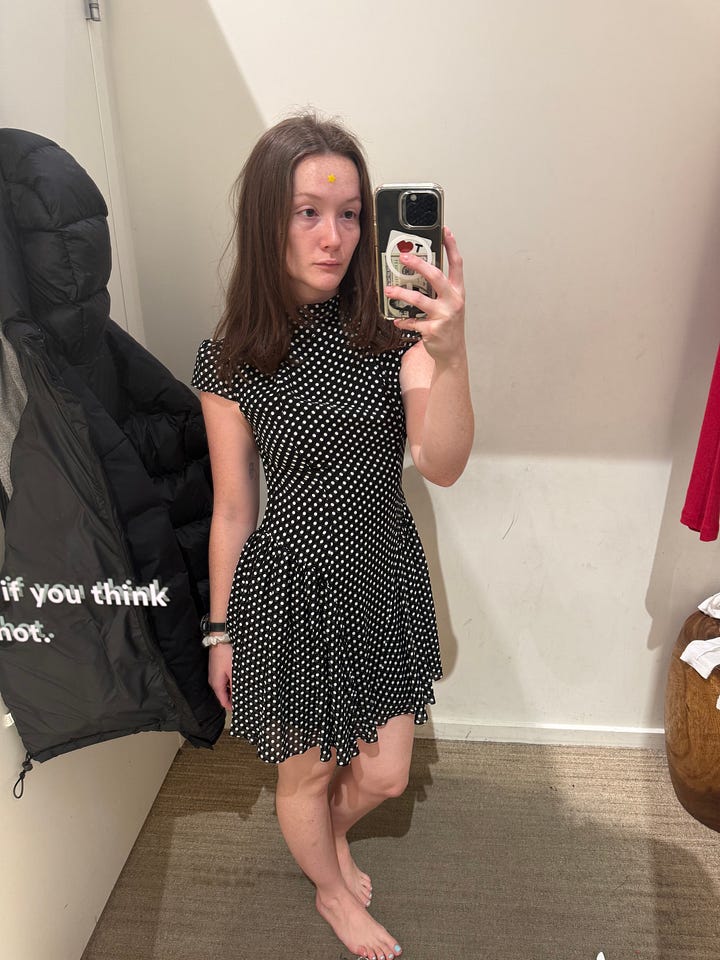 On Sunday, I visited Rainy Sunday Morning House to get some gifts, the best spot to do so, in my humble opinion. I then engaged in some further retail therapy for myself, visiting Reformation on Ludlow, where I tried on a bunch of things and walked out with only two. This skirt, which I think is the most flattering skirt I’ve ever tried on, and this dress, both of which felt like smart investments for my life at the moment. I didn’t end up getting the top that’s styled with the skirt below, but I feel like maybe I should’ve. The bags under my eyes are because I haven’t slept a full eight hours in weeks, counting how many times I’ve woken up per night.