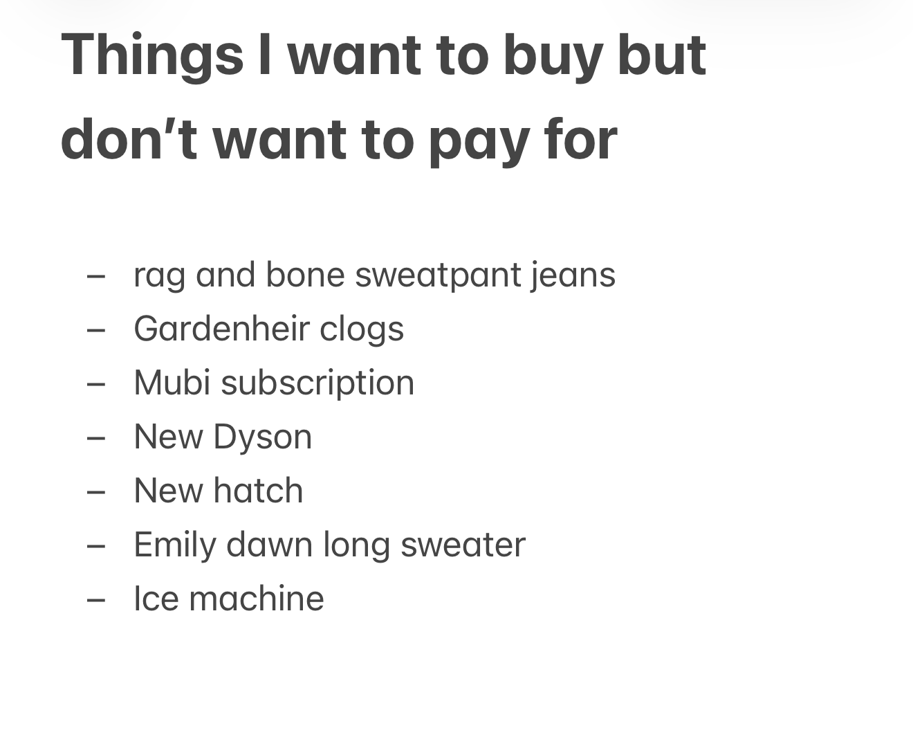 I have a list on my phone called “things I want to buy but don’t want to pay for”.