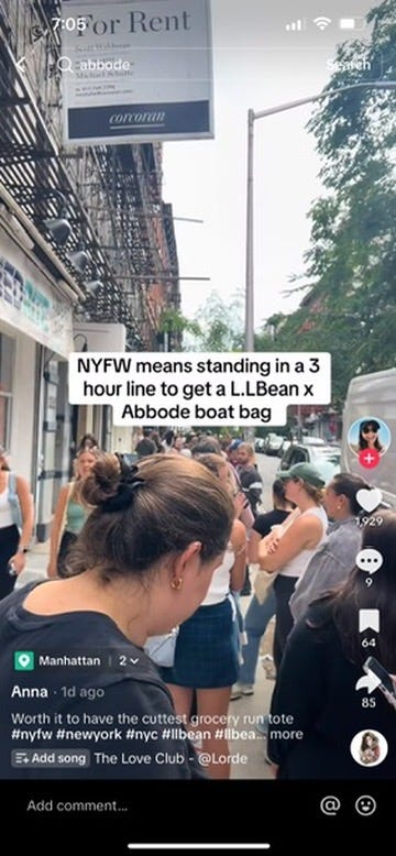NYFW pop-ups have invaded Lower Manhattan. If Chelsea Parke sells one more sweatshirt, they might have to give her a key to the city. Did you guys know L.L. Bean will embroider your bag online? You don’t have to sleep on Elizabeth Street to go to the Abbode collab. I’m tired just watching everyone. Everyone is keeping their summer momentum surging into the fall, so I guess the rest and relaxation I’ve been desperate for is still in the distance. New Yorkers saw their shadow and refuse to let party-girl summer go.