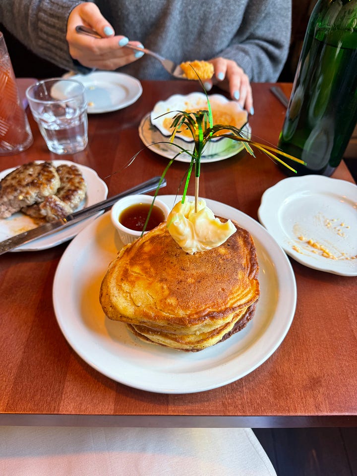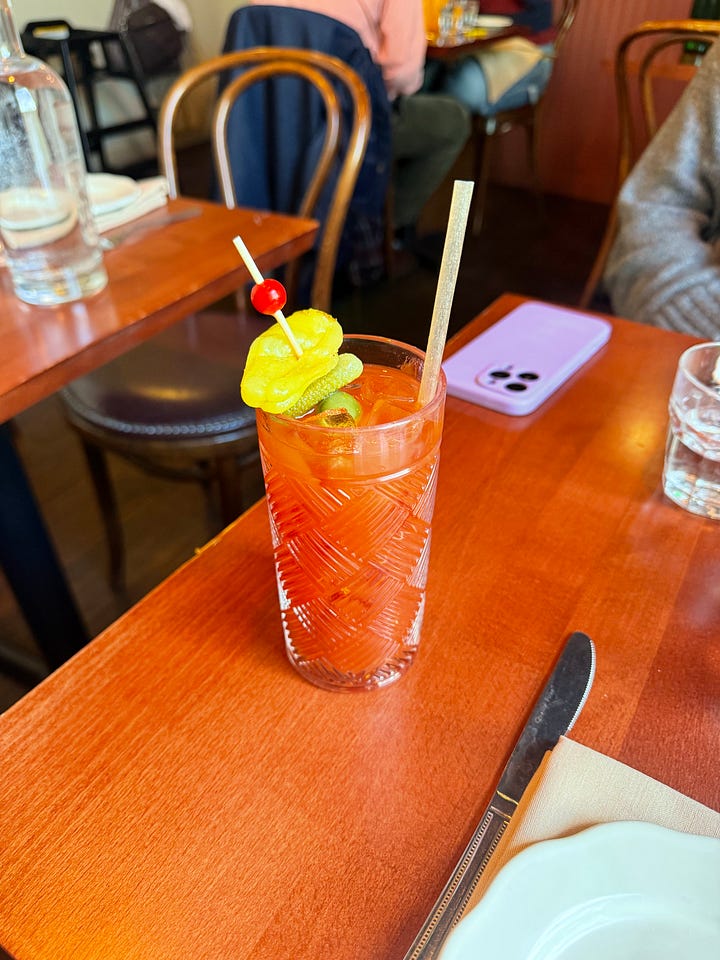 Saturday, I woke up early—to my dismay—and did some chores before walking across the Williamsburg Bridge to meet my friend Eva for brunch at Rose Marie. This was another place on my list, from the owners of Yellow Rose in the East Village. I’ve been craving a bloody mary for a few weeks (your guess is as good as mine), so I squashed that before also having a shortstack of pancakes that came with some tassels.