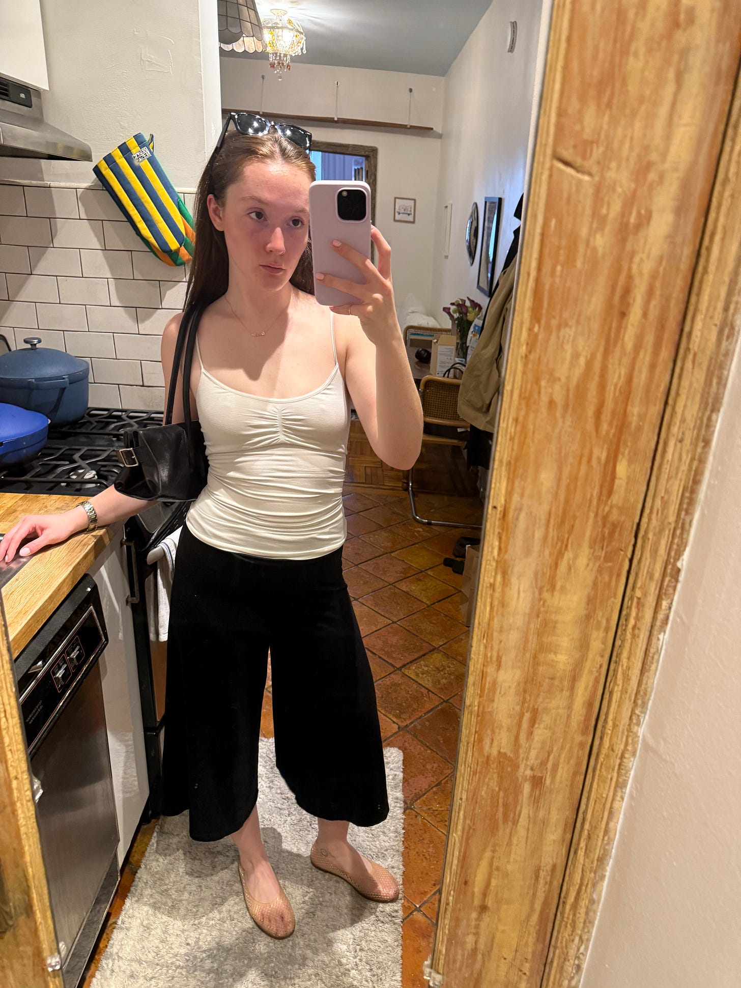 On a day like Saturday, you leave your apartment in the early afternoon, and don’t know if you’ll be back until the early hours of the morning. I dressed the part, wearing my jelly flats, gauchos, and a sporty tank top, with dinner plans that evening where I felt like this would hold up. I had a brief 30-minute intermission in between my activities, swapping out the tank for my treasured Susana Monaco tube top and tossing on a vintage white label Levi’s jacket because the temperature was sadly and suddenly beginning to drop.