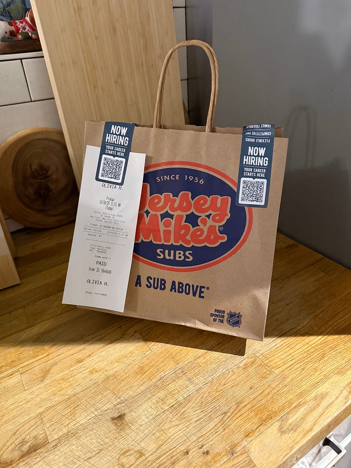 Today, Sunday as I write this, I ordered Uber Eats twice before noon. It simply had to happen. I’ve watched record numbers of Law and Order S.V.U., and have taken slow, steady sips of an LMNT-filled Owala. I was cured by a combination of Excedrin Migraine, a smoothie called the Hangover Head from Juice Generation, and a sandwich from Jersey Mike’s. Friday night was spent self-worshiping, I got a 30 minute back massage and 30 minute foot massage from my safe haven, Zu Yi Spa, and ordered Bobwhite Counter while watching the Karen Read docuseries on Max. I miss that level of bliss while experiencing a splitting wine carafe-induced headache.