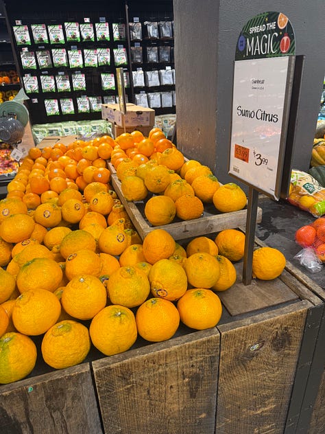 Get fun things from Whole Foods like kombucha and blue cheese olives for a snack alongside the ingredients for soup. It’s also Sumo Orange Season, so I got 3 for $13 (woof).