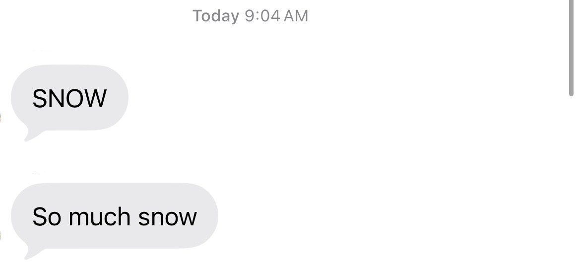 Once I saw the texts from my friends, I immediately opened my window and was filled with the feeling of being a little kid again. I felt like I had slept with my pajamas inside out and flushed an ice cube down the toilet (IYKYK). It wasn’t a work day, so there was no chance of stealing some extra solace for myself, it was just that warm and cozy feeling of being snowed in for the day. I couldn’t wait to go outside.