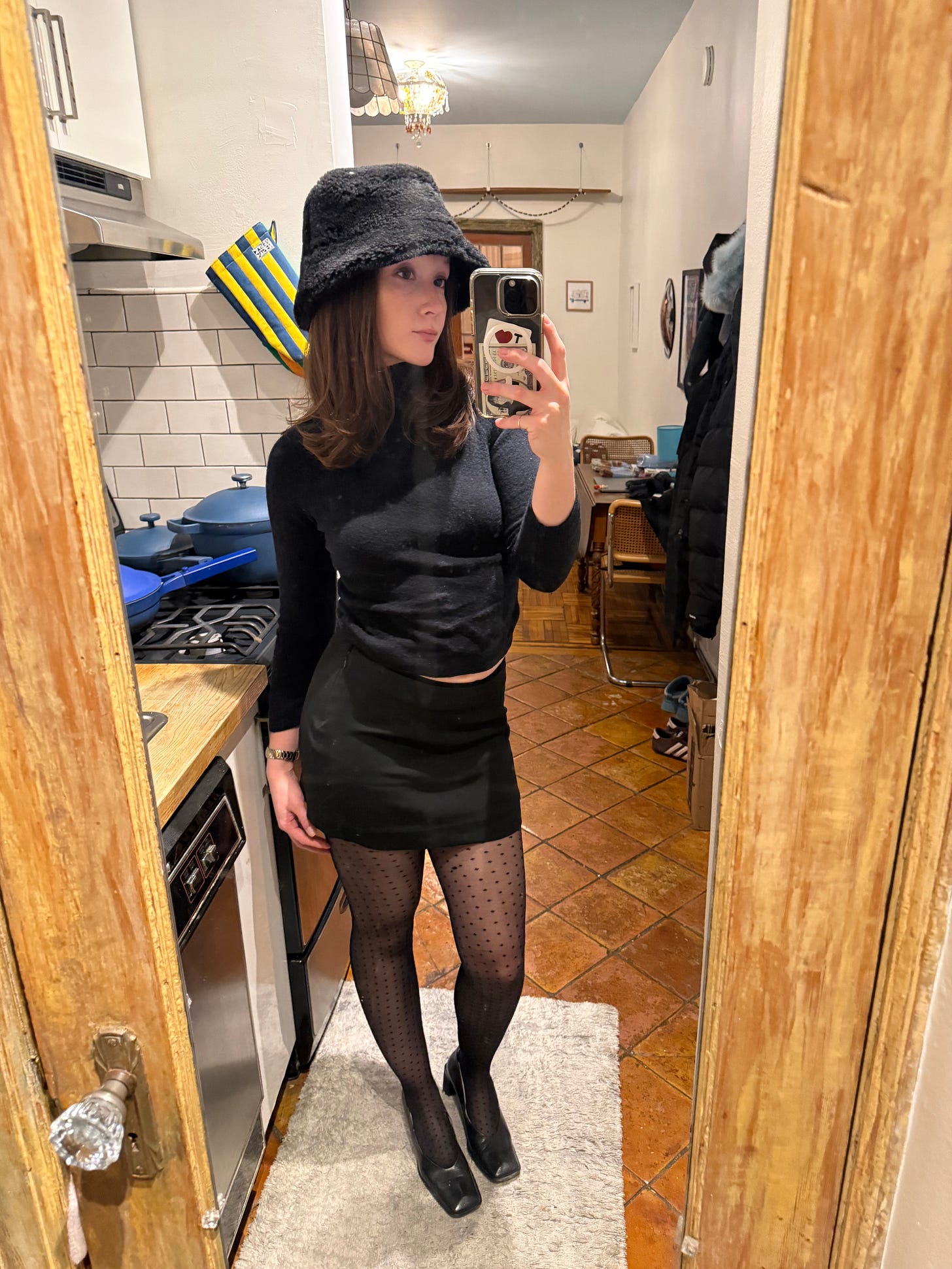I wore this wool hat from Favorite Daughter (if you cut the tag out carefully it’s reversible), this turtleneck from Abercrombie (linked a Gap one because this one is old), this skirt from Reformation, these tights from Los Angeles Apparel, and my mom’s vintage Hugo Boss heels. I felt like a British spy.