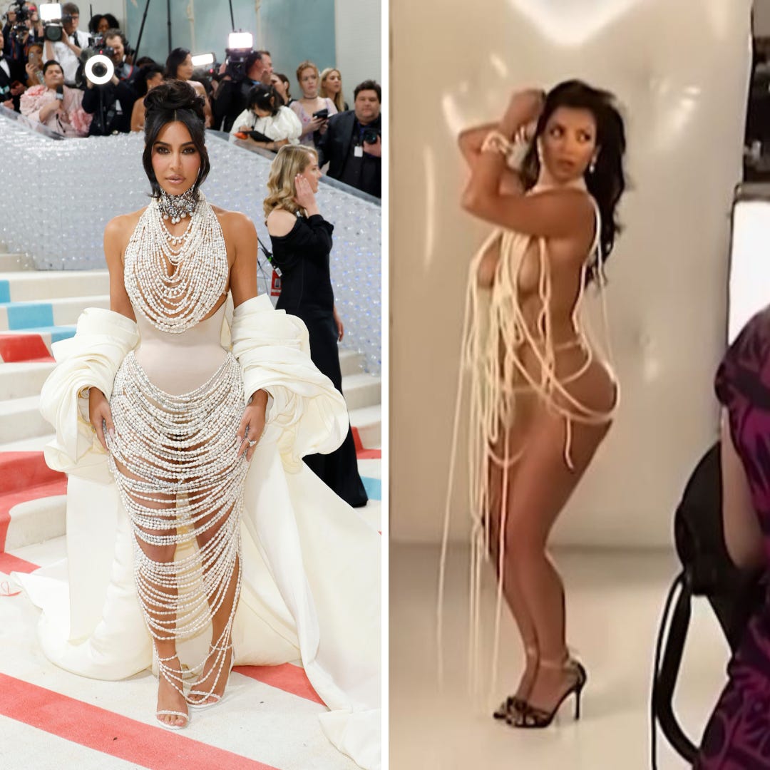 I originally wanted to see Kim in Chanel since she was so close with Mr. Lagerfeld, but focusing in on the accessories that made him so iconic—the pearls—felt like a really smart move to me. They’re all real pearls which makes this feel amazingly rich, and this is an unintentional, iconic nod to Kim’s Playboy photoshoot from the early 2000s (pictured right).