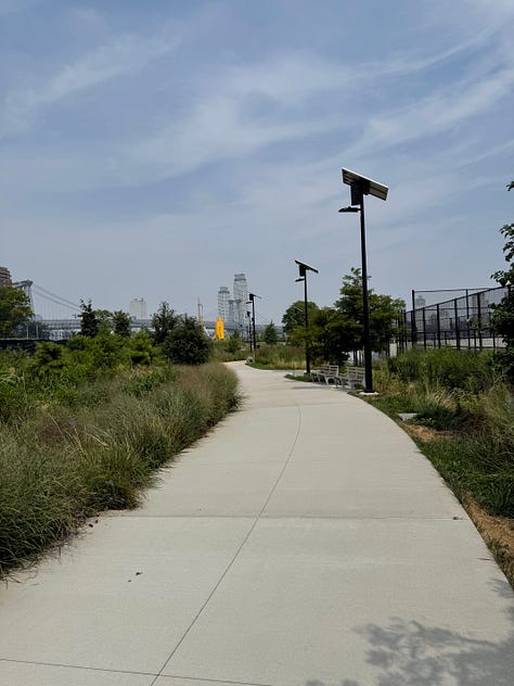 On Saturday, I went to heated Pilates, got a foot massage while reading the new Michael M. Grynbaum book, Empire of the Elite: Inside Condé Nast, the Media Dynasty That Reshaped America, and then embarked on what turned into an urban hike trying to find the new East River Greenway. I saw a completed section during my walk home from work over the Williamsburg Bridge, and figured it would be a nice place to get some steps in. I tried to enter near Cherry Street, but found it was still under construction. I then walked along the East River to Pier 36, where I tried to walk around but ran into a DSNY BBQ. Then, I found a patch of completed Greenway, that led to a makeshift bridge over the FDR that was very scary to cross. I marched north until I finally found the Delancey footbridge, that led me to a pristinely clean, brand new open space: