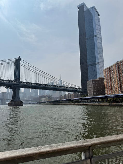 My favorite part of the city is Chinatown. I love the food, the culture, and immersing myself in the local businesses. Whoever posted the Dimes Square fruit slushy place on TikTok, count your days, because I had to wait 30 minutes for one on Saturday. It was worth every second spent in the heat, sweating for my Peach ice, and I’m overjoyed for the success of a local business, but don’t make it at my expense! (Hopefully you can tell I’m half-kidding. I’m a walking gentrification Nolita Dirtbag meme). On my urban hike to the East River, I got deep in the Lower East Side, discovering quiet tree-lined streets of townhouses and families enjoying the sun. I used to believe that no one under the age of 18 should live south of 14th Street and east of Bowery, but I take that back. Every time I walk under the Manhattan Bridge while a train is running through, I feel like a character in a Sofia Coppola Movie.