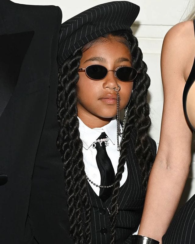 She was a breath of fresh air from the incredibly stale Couture Season. I’m tired of seeing TikTokers invited to shows, designers stealing from each other, and influencers pretending like they know what’s up. I can’t get enough of these outfits by North on my feed. I’m on the edge of my seat to see what she wears tomorrow, and am fearful that this may be a premature post. The content to be served after this? Sure to be setting the bar for mega-celebrity children to come.