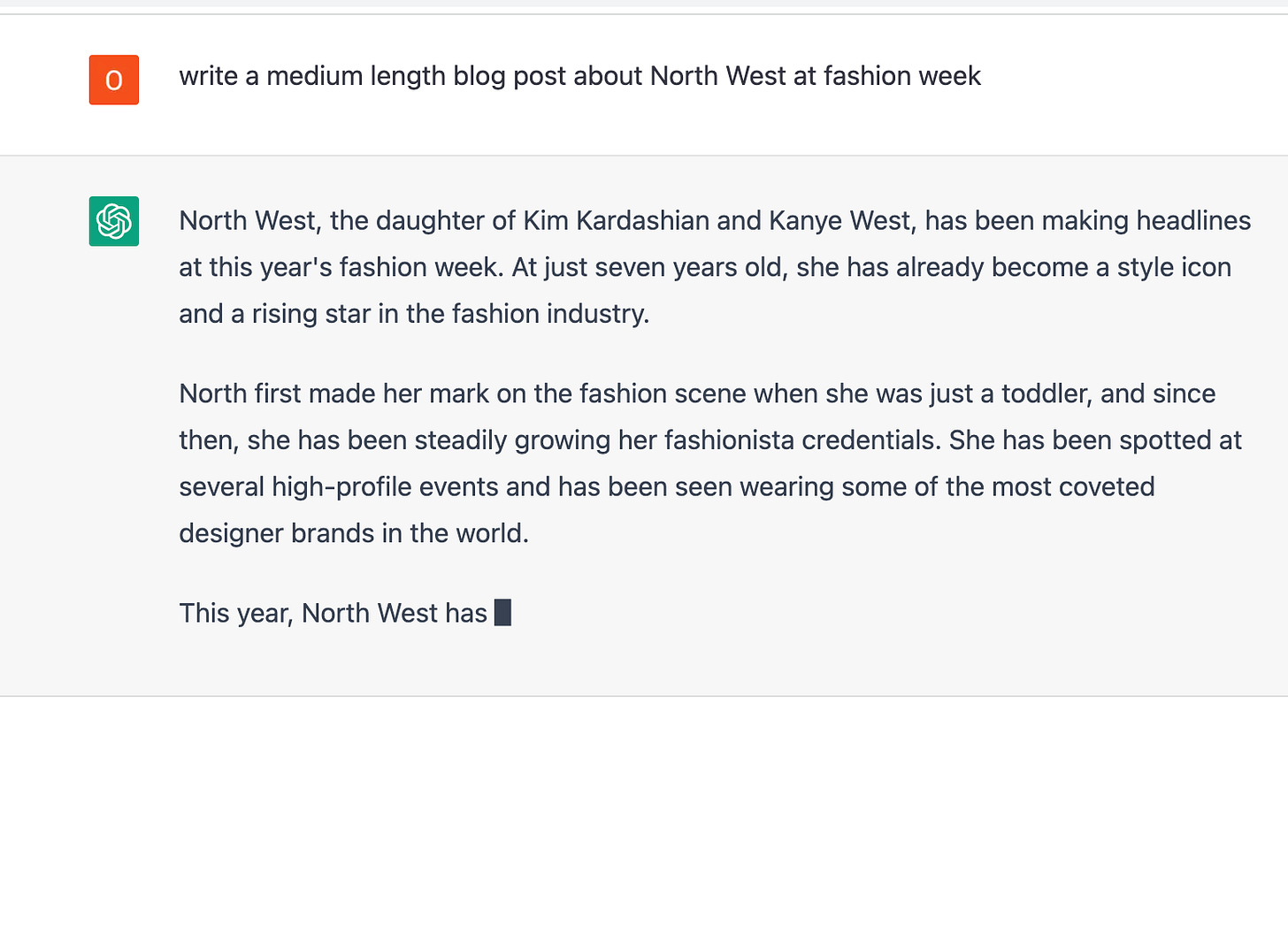 I even asked for it to write a blog post about North West attending Paris Fashion Week, a topic I covered on this platform a few months ago. Here’s what Miss. GPT came up with: